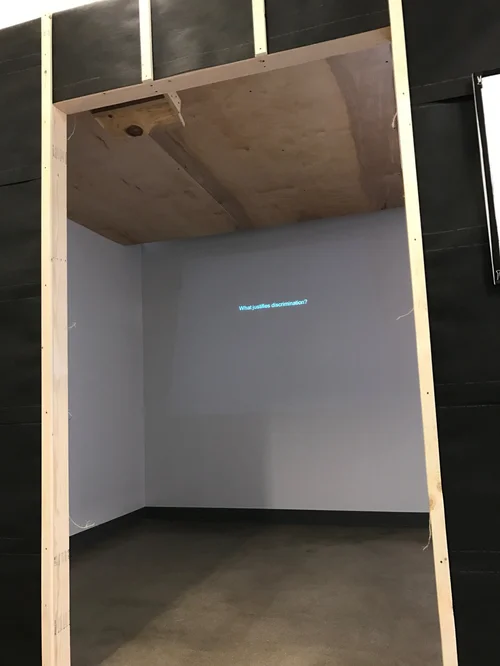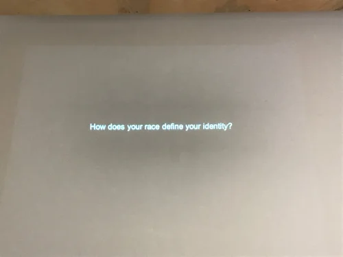 Questions about race, identity, discrimination are projected on the wall upon entering the Barracks.