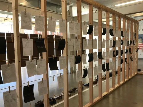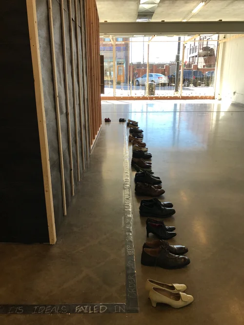 The open half of the structure looks toward the future and invites people to give responses to questions and their hopes for the future. Hanging responses up on the wall creates a constantly evolving exhibit and represents the voices of Springfield, Missouri.